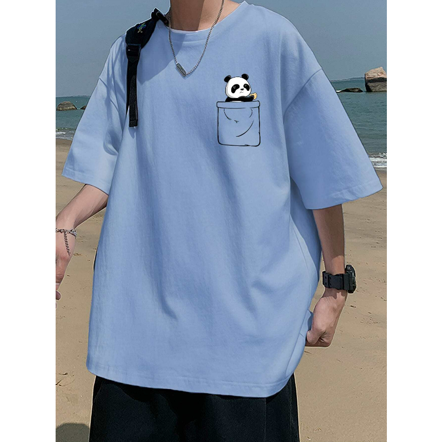 Camiseta Larga Manga Curta Estampada Panda Pocket Blusa Oversized Ombro Caído T-shirt Skatista Streetwear