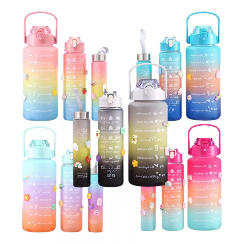 kit 3 Garrafas Motivacional de Água com Adesivos 3D Degradê 2Litros e 900ml e 300ml Canudo