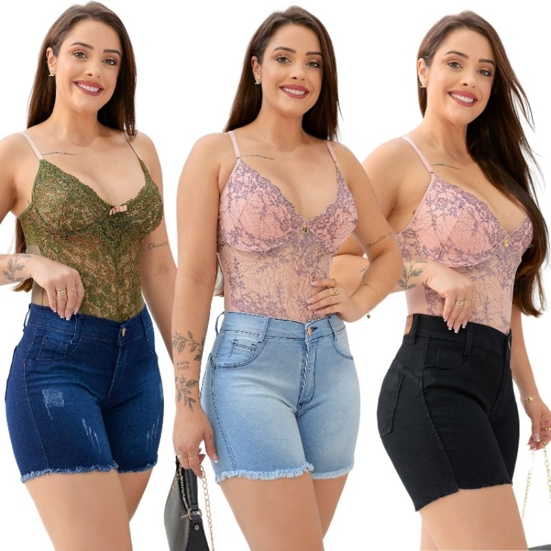 Kit 3 Shorts Jeans Feminino Cintura Alta Com Lycra Elastano Veste Bem