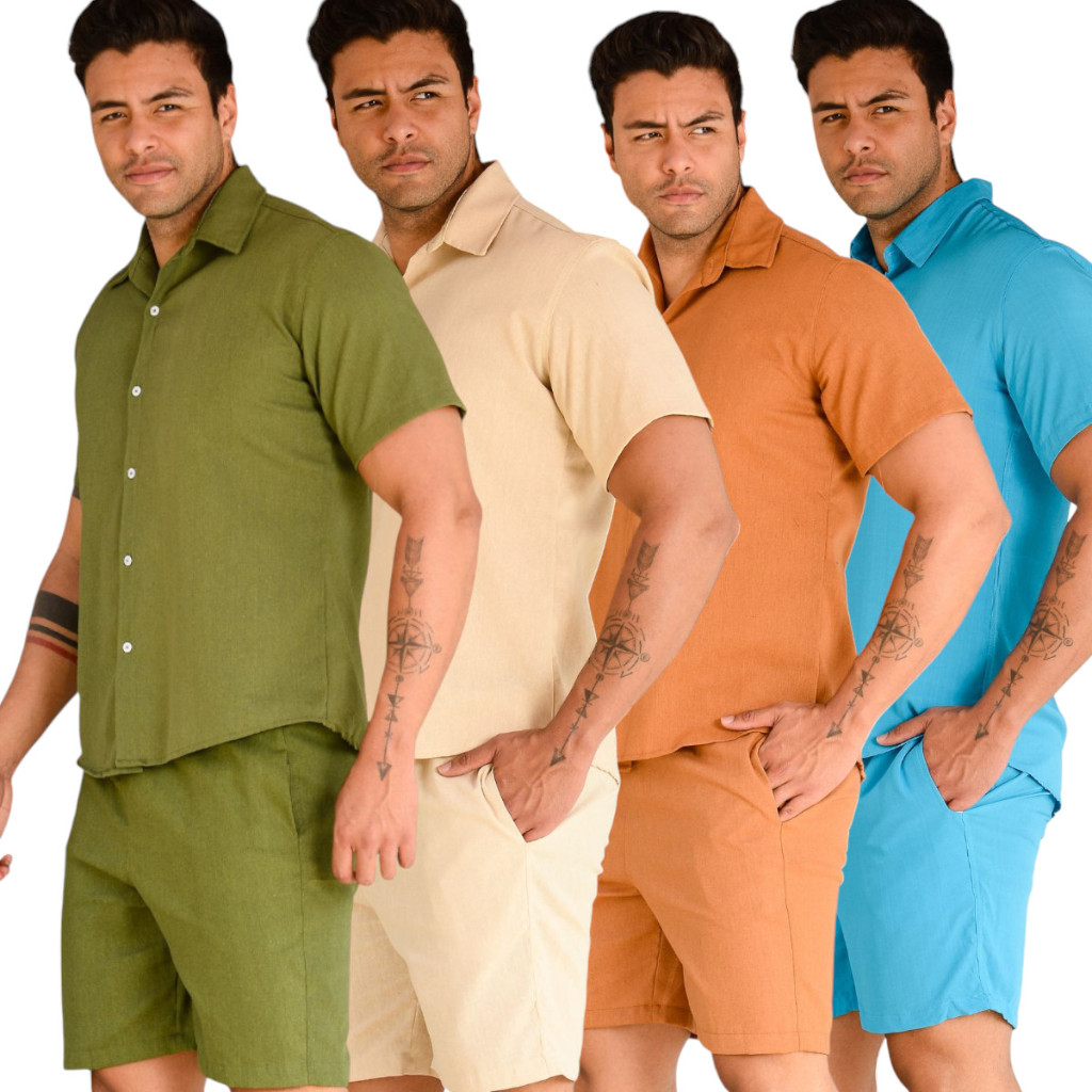Conjunto Linho Camisa Short Masculino Moda Praia
