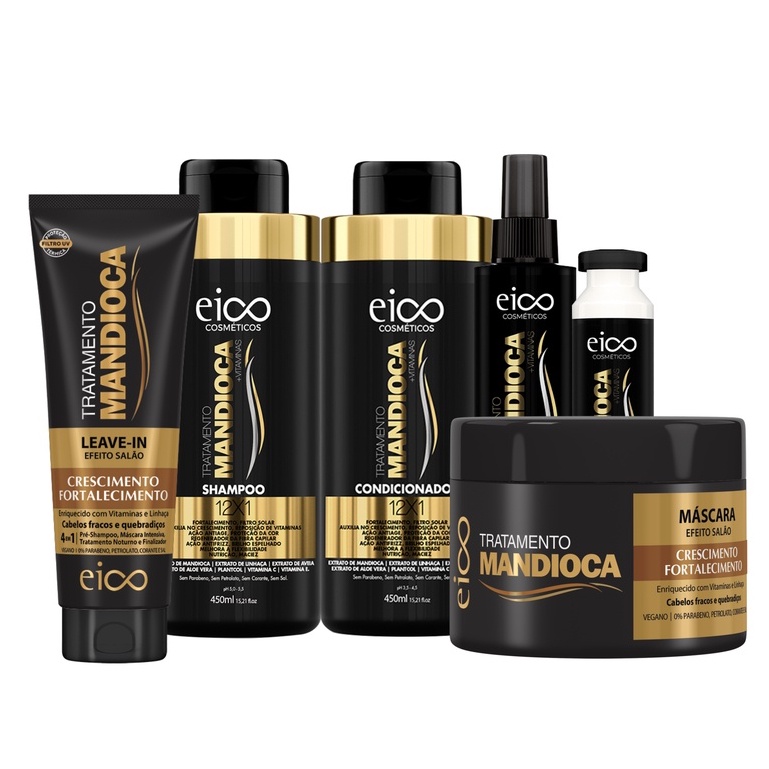 Eico Mandioca Shampoo Condicionador + Máscara Hidratação + Leave-in + Spray Protetor Térmico + Ampola Força Crescimento