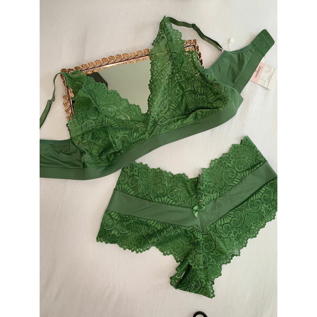 Conjunto Mila Sem Bojo Renda E Micro Calecon Com Detalhes De Renda Verde Agave