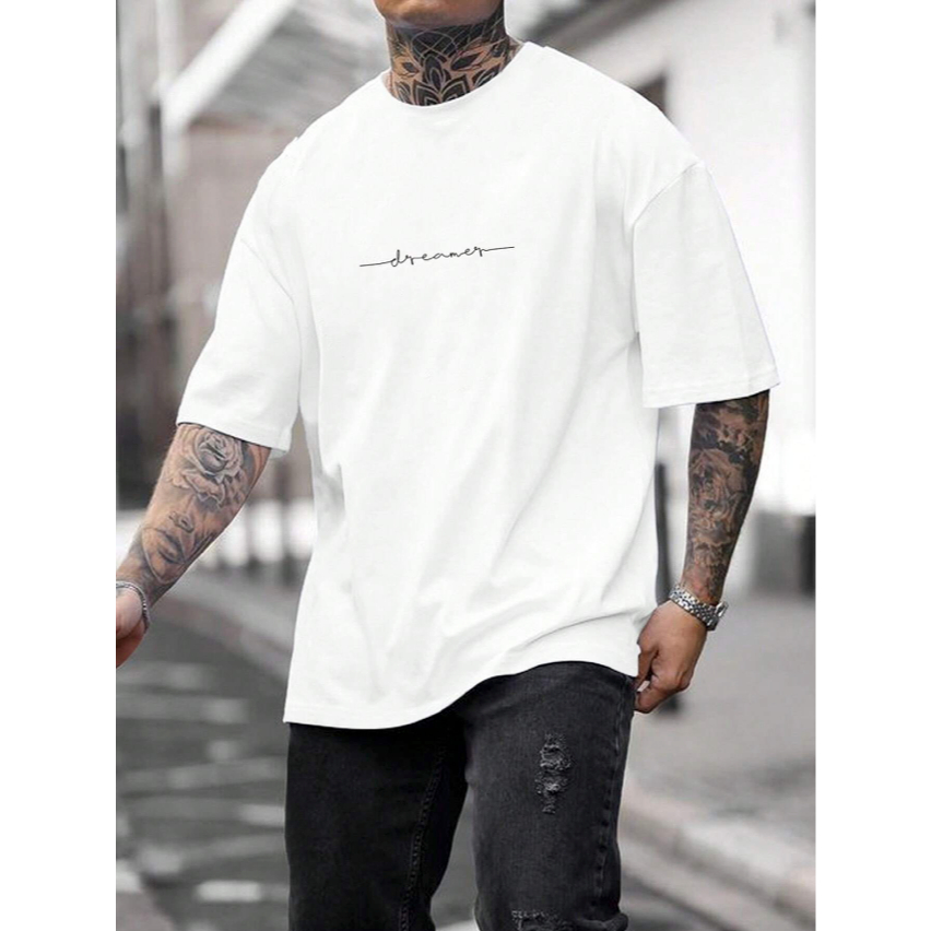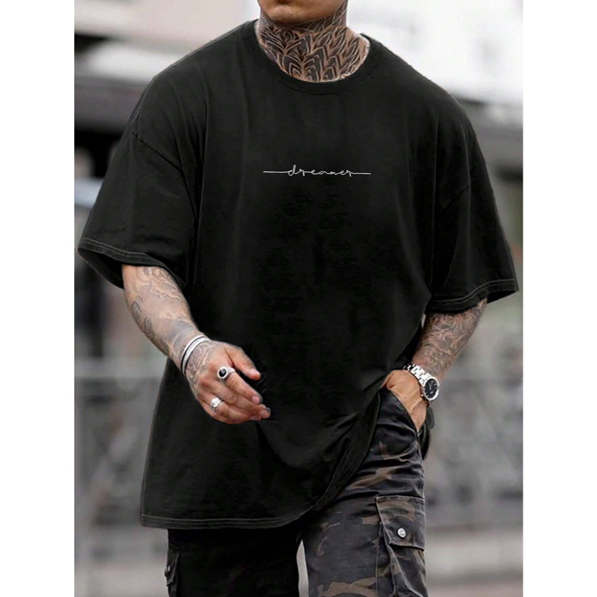 Camiseta Oversized Bordado Grafico Estampado Dreamer Palavra Sonhador Meta Vida Motivação Sucesso Confiança Life Style Manga Curta Ombro Caido Masculino
