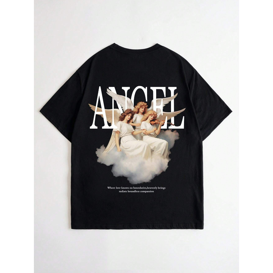 Camiseta Aesthetic Larga Longline Estampa Angelical Violino Bordado Nuvens Angel Picture Blusa Ombro Caído Unissex Estampa Desenho Anjos Oversized Unissex