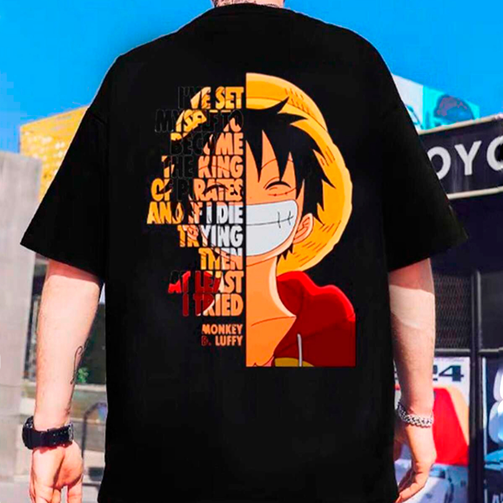 Camiseta Luffy One Piece Estampa Grafica Desenho Animado Rei dos Piratas Sorridente Texto Morrer King Of Pirates Blusa Long Line Ombro Caido Manga Curta Oversized