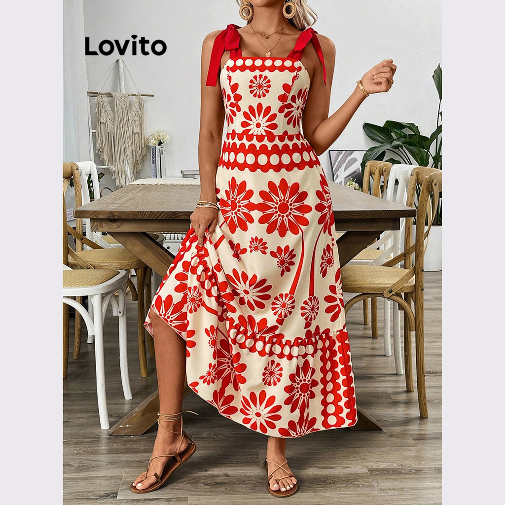 Lovito Vestido elegante floral com renda e babados com bainha padrão para mulheres LNL77459