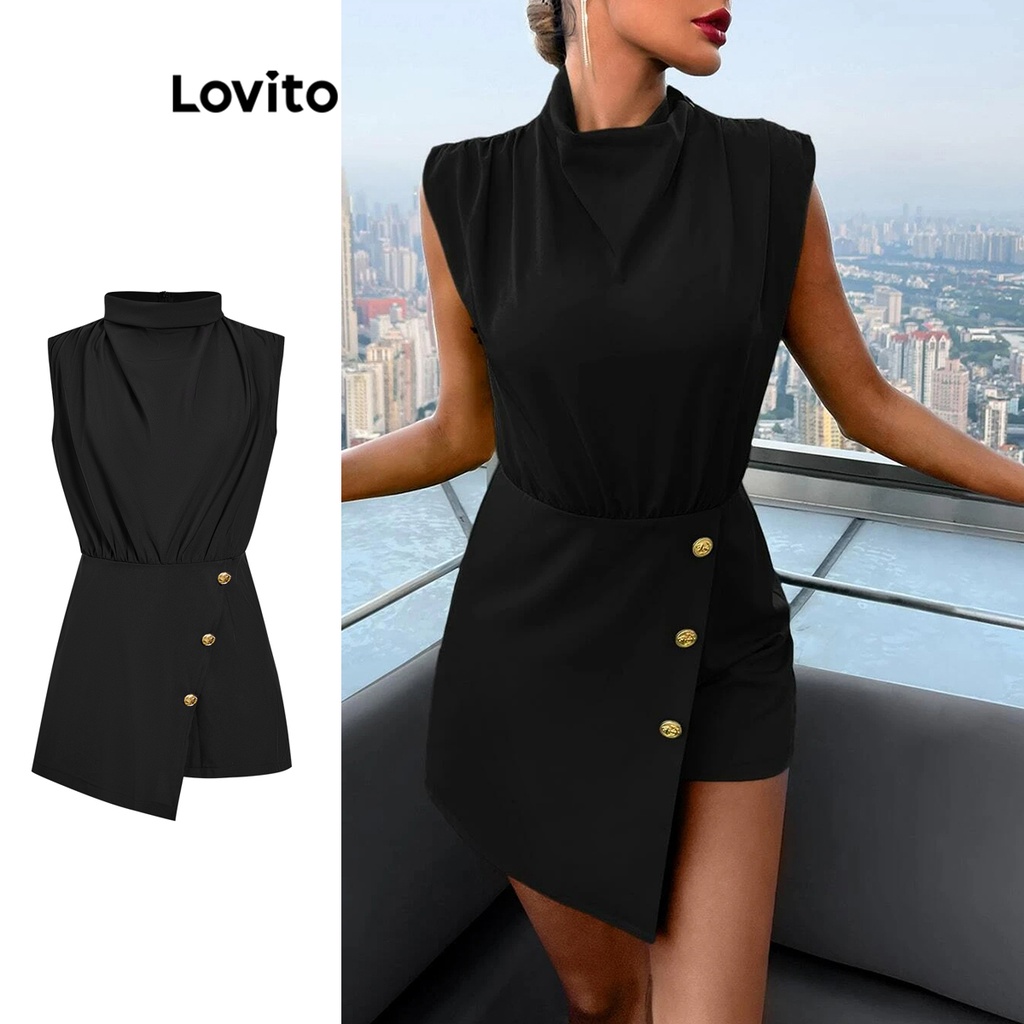 Lovito Elegante Macacão Feminino Liso Assimétrico com Botão de Metal L74ED375