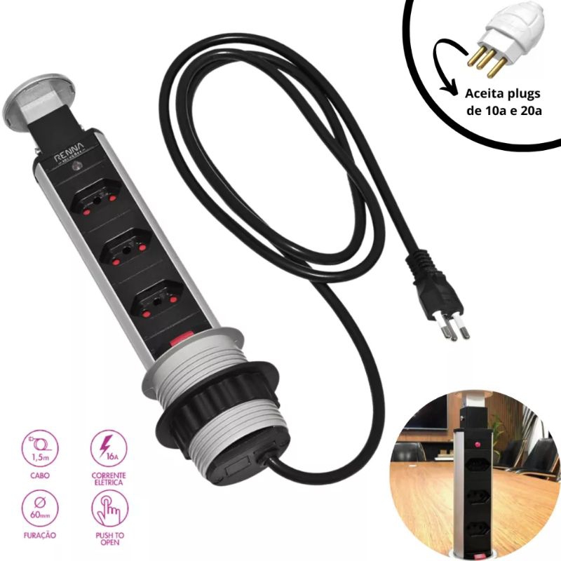 Torre De Tomada para Bancada de Embutir Retrátil Multiplug 3 Tomadas 16A Bivolt
