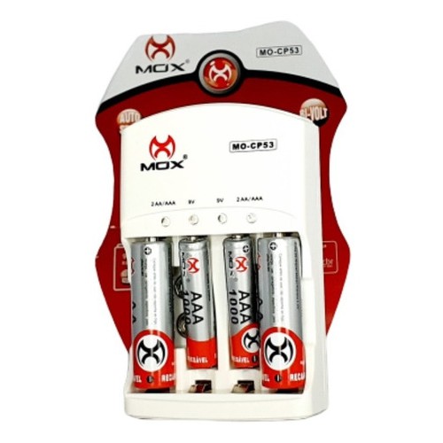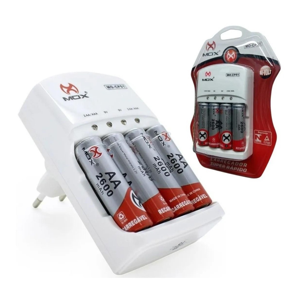 Carregador De Pilha AA x AAA e Bateria 9V Mox Com 4 Pilhas Aa 2600mah Recarregável