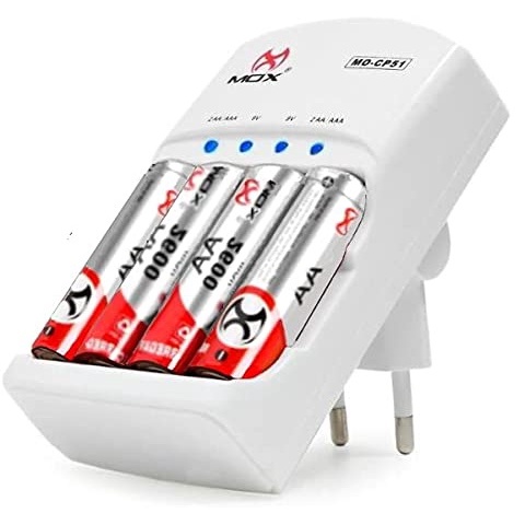 Carregador De Pilha Mox Mo-CP53 com 2 Pilhas AA 2600mAh e 2 Pilhas AAA 1000mAh Palito Recarregáveis e Led Inmetro Bivolt