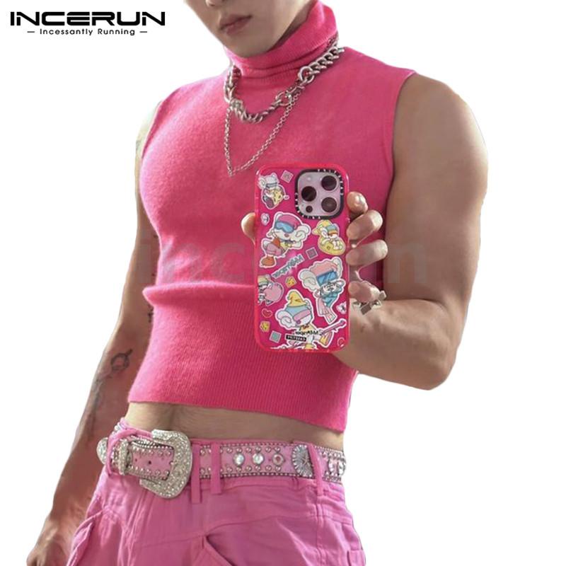 INCERUN Moda Barbie Masculina Sem Mangas Colarinho Alto De Malha Sólida Versátil Topo Do Tanque