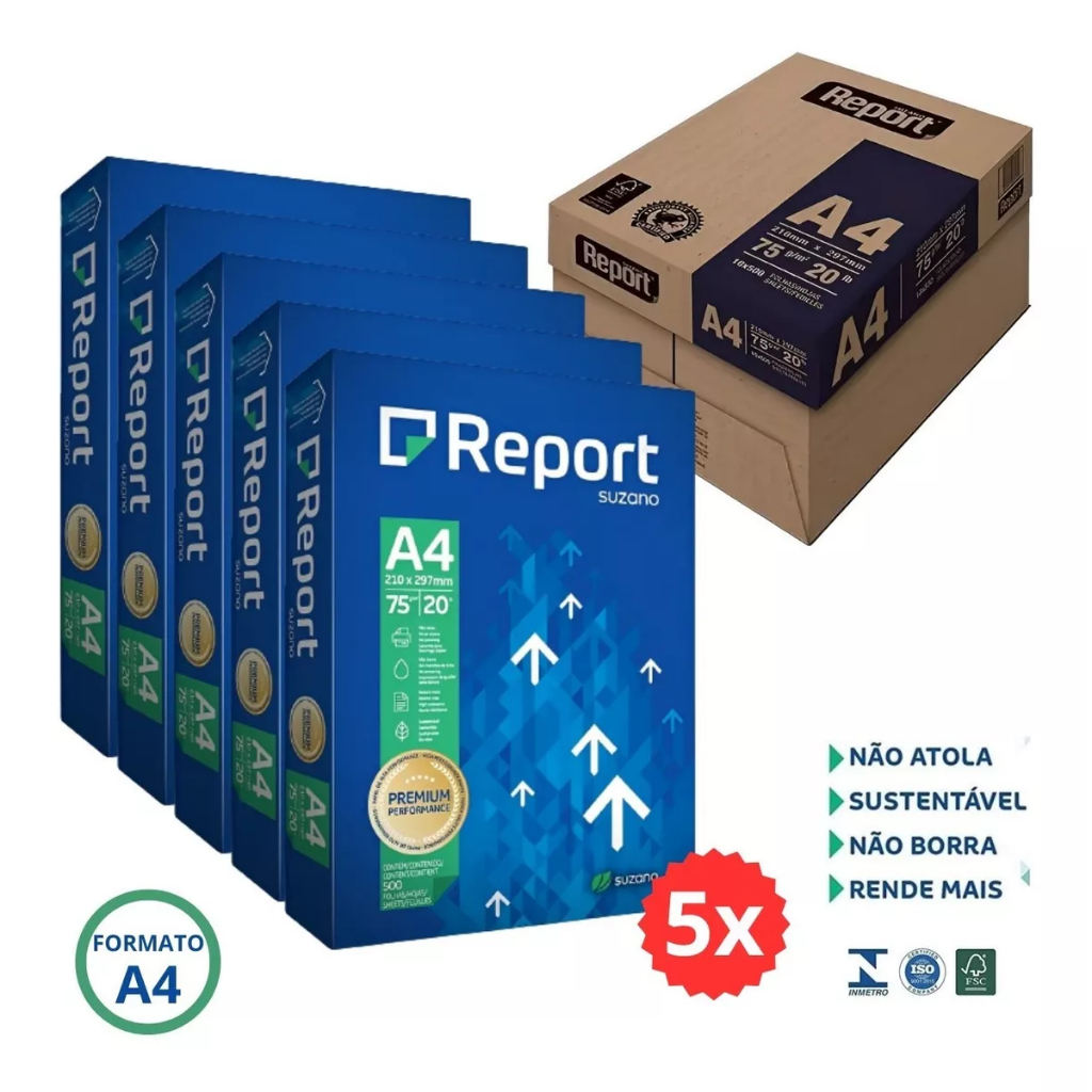 Papel Sulfite A4 Report 5 Resmas 2500 Folhas 75g Com 500 Folhas Cada Resma