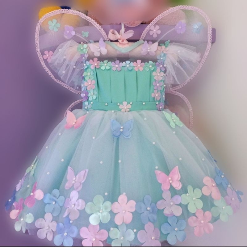 Vestido Jardim Encantado Verde Água Luxo + Asa + véu de armação - Tamanho 1,2,3 e 4 anos - Leia a Descrição