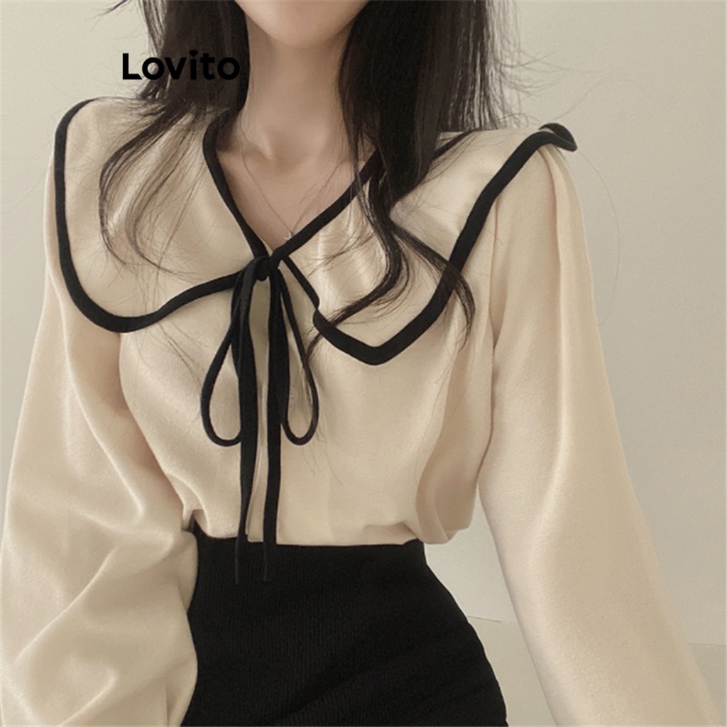 Lovito Casual Blusa Feminina Lisa Amarrada de Manga Bispo com Babados e Fita de Contraste LNE24175 (Multicolorido)