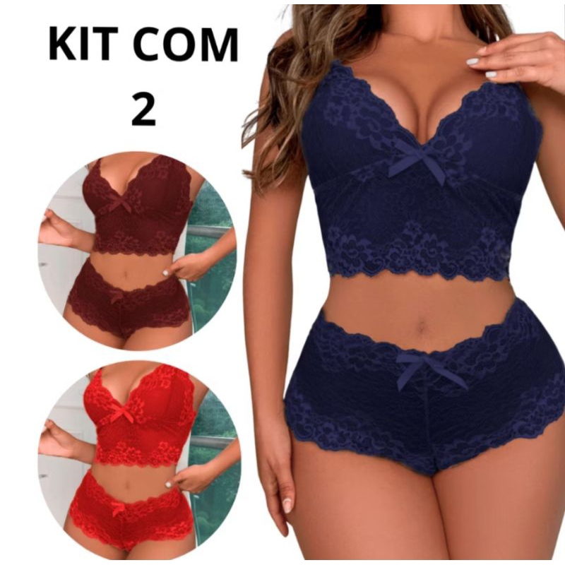 Kit 2 Conjunto Renda Espera Marido Feminino Sensual Com Forro Sem Bojo Langerie Baby Dool Sexy Império da Moda Íntima Promoção