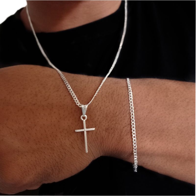 Kit Corrente colar cordão grumet 1,5mm com pingente cruz + Pulseira Banho de prata 925