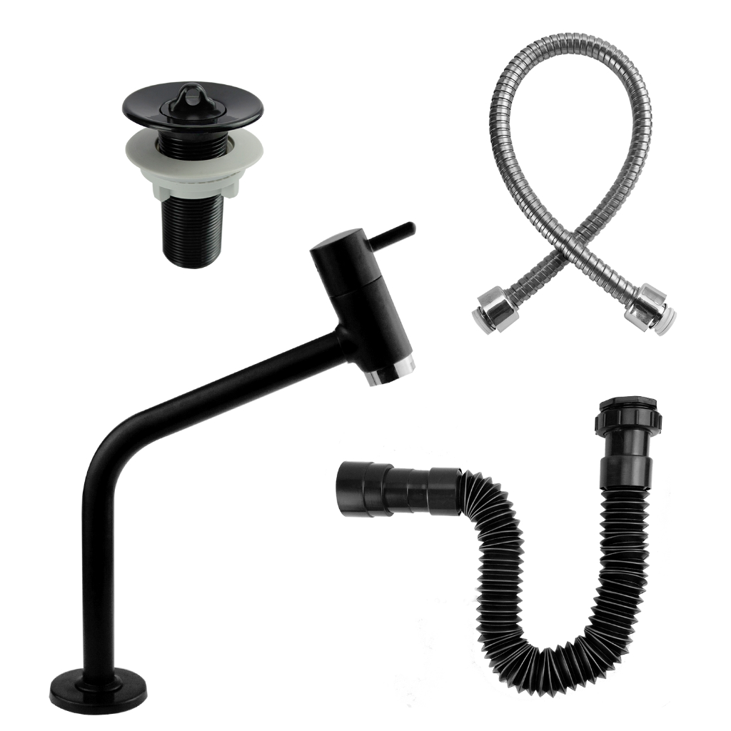 Kit Torneira de Banheiro Lavatório Cuba Link Alta 3060 Metal Preta + Valvula 7/8 + Engate 50 cm + Sifão Black PRETO 2120 Cód.