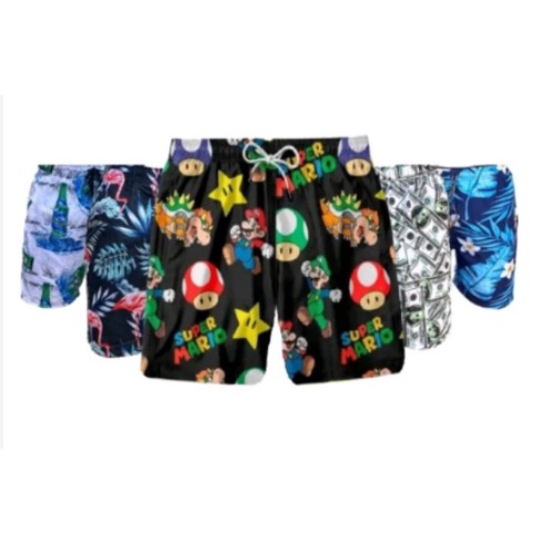 Kit 3 Bermuda Shorts Mauricinho Calção Moda Praia Piscina Masculino Tactel Surf Estampas Desenhos Animados Bebidas Florais Verão