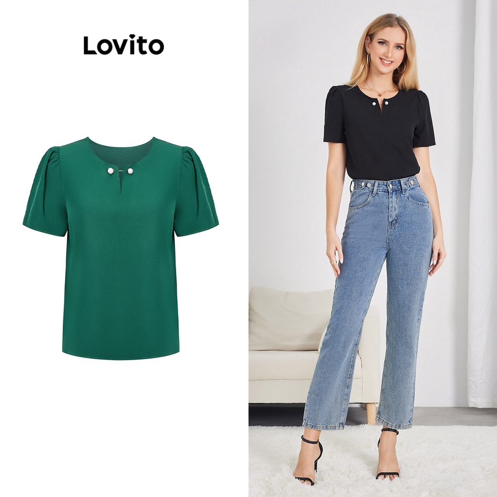 Lovito Blusa com Botões Frontais e Bolsos Falsos para Mulheres LBE04012 (Preto)