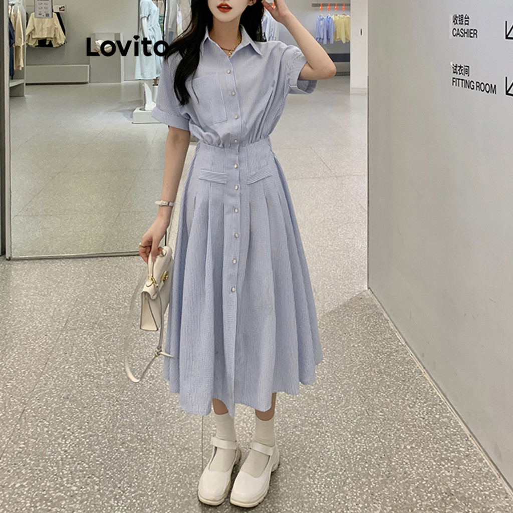 Lovito Vestido Casual com Botões Frontais Falsos e Bolsos para Mulheres LNL38095 (Alperce/Azul)