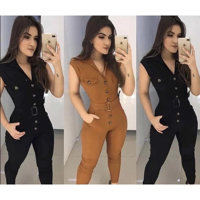 Macacão Longo Feminino Botão Cinto Macaquinho Bengaline