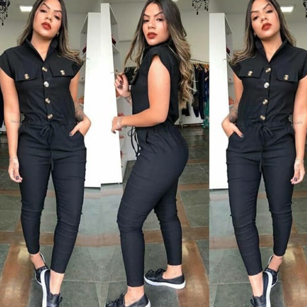 Macacao Bengaline Macaquinho Jogger Feminino Manga Curta Botao