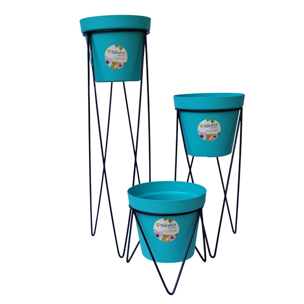 Kit 3 Vasos De Planta Diamante Nº1 Polietileno Decoração Jardim + 3 Suportes Tripé Ferro com Pratos