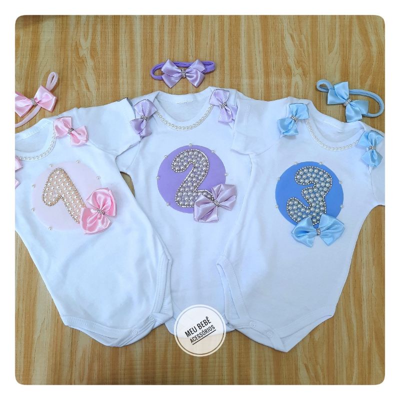 Body Mesversario Para Bebê Kit Com 3 Bores Roupa De Mês Personalizado Temático Menina