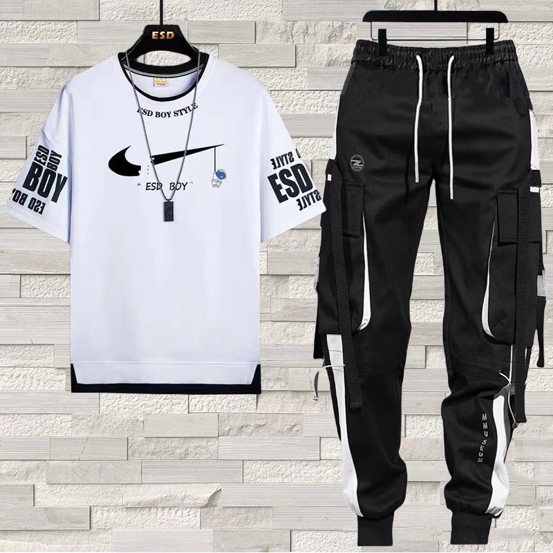 Ternos Masculinos Hip Hop Streetwear Calças De Carga + Moda Casual Camiseta Manga Curta Conjunto Masculino