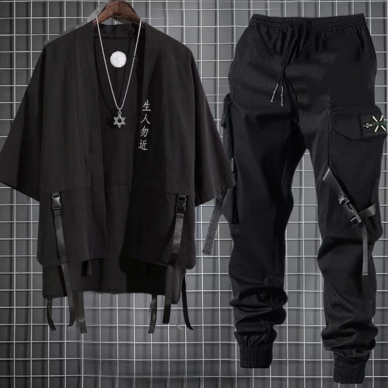 Calças Cargo Masculina Hip Hop Preto Fita Streetwear Harem Pants Jogger Bolsos Masculinas + Manga Curta Conjunto Masculino Camisa De Rua + Estilo