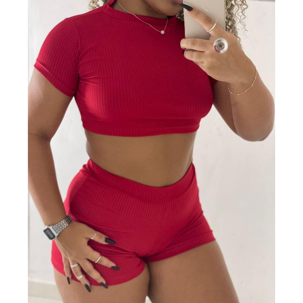 Conjunto Feminino Cropped Gola Alta Manga Curta E Short Canelado
