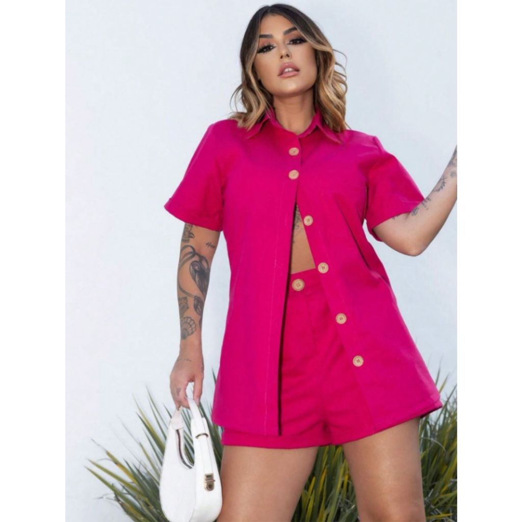 Conjunto Feminino Camisa Manga Curta e Short Bermuda Cintura Alta Linho