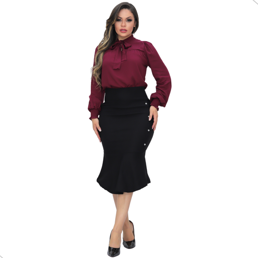 Conjunto Evangélico Feminino Saia Cintura Alta e Blusa Manga Longa Elegante com Laço Amarração Suave
