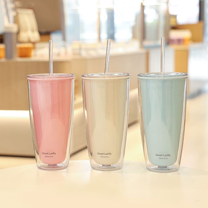 Copo De Plástico Dupla Camada 750ML Com Canudo E Tampa