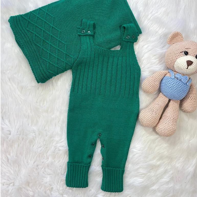 Kit 2 Saida Maternidade Manta e Macacão Salopete Infantil Recem Nascido Tricô Menina e Menino