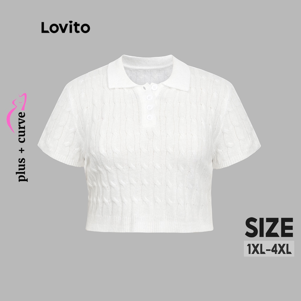 Lovito Curvas Plus Size Blusa Feminina Lisa Casual Polo de Tricô com Botão LPS06006 (Branca)