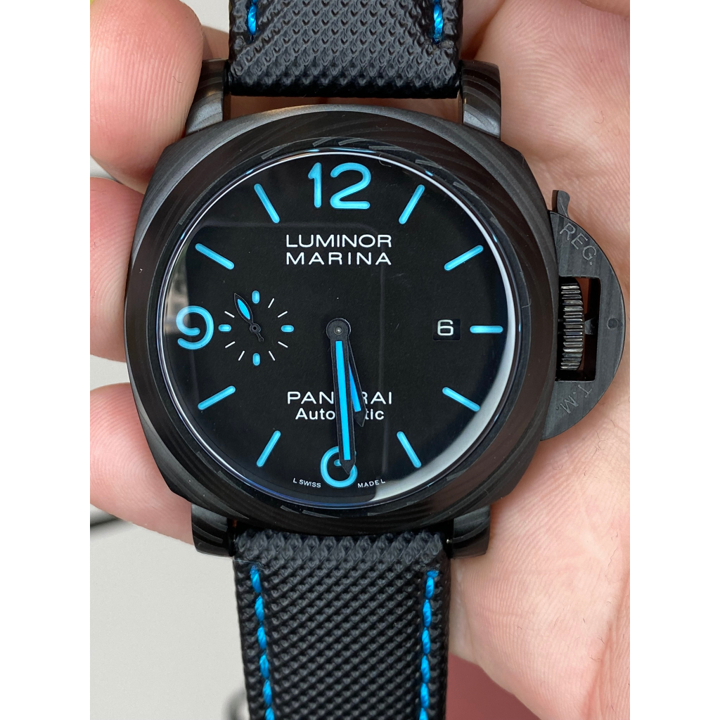 Relógio de pulso, M4r1n4, vidro safirado, caixa e bezel em aço preto inoxidável, fundo preto com detalhes em azul, pulseira em nylon e couro com costura em azul, fecho fivela conforma original, máquina Citzen, movimento automático, a prova d’água
