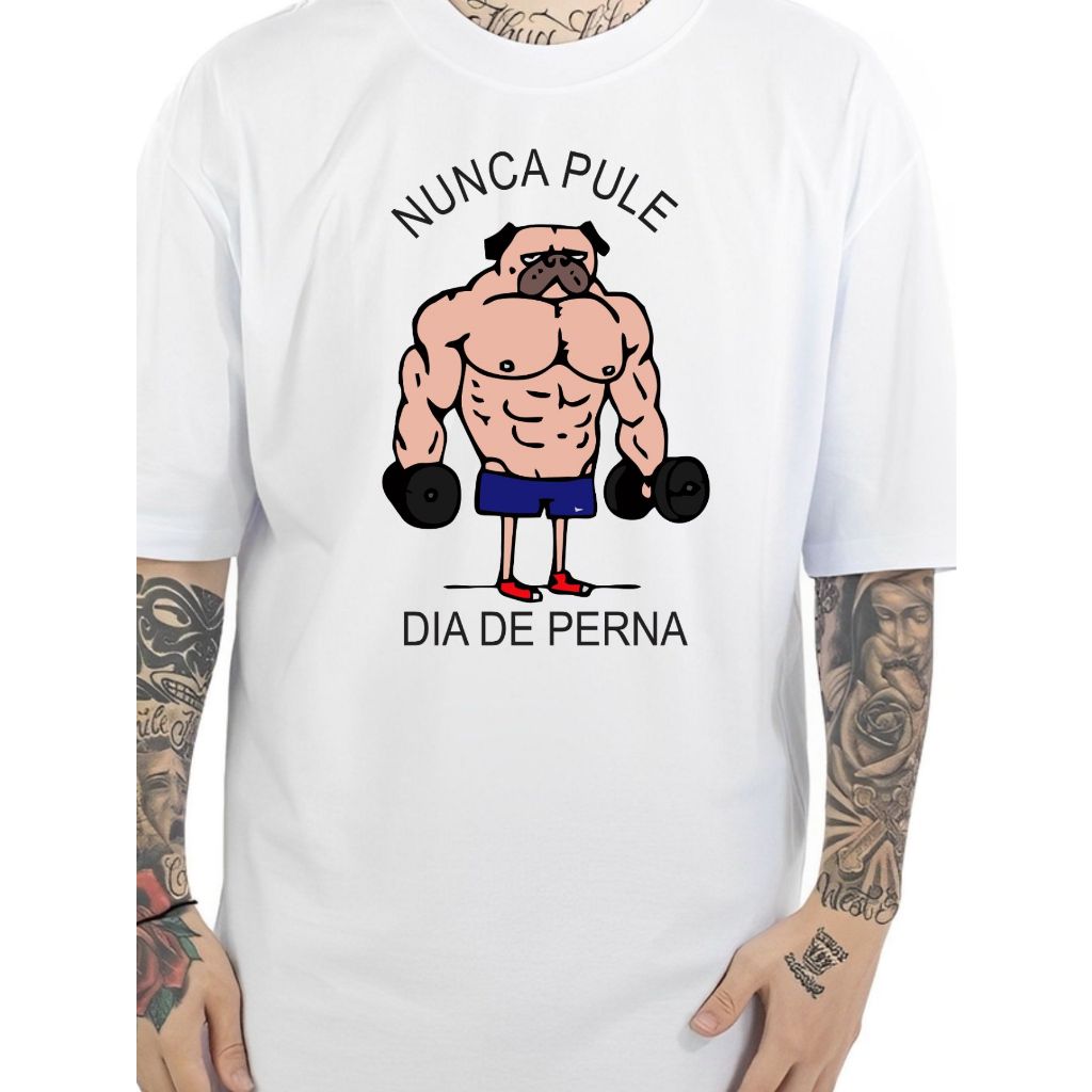 Camiseta Estampa Fitness Nunca Pule Dia De Perna Masculino Feminina Poliéster Confort Casual