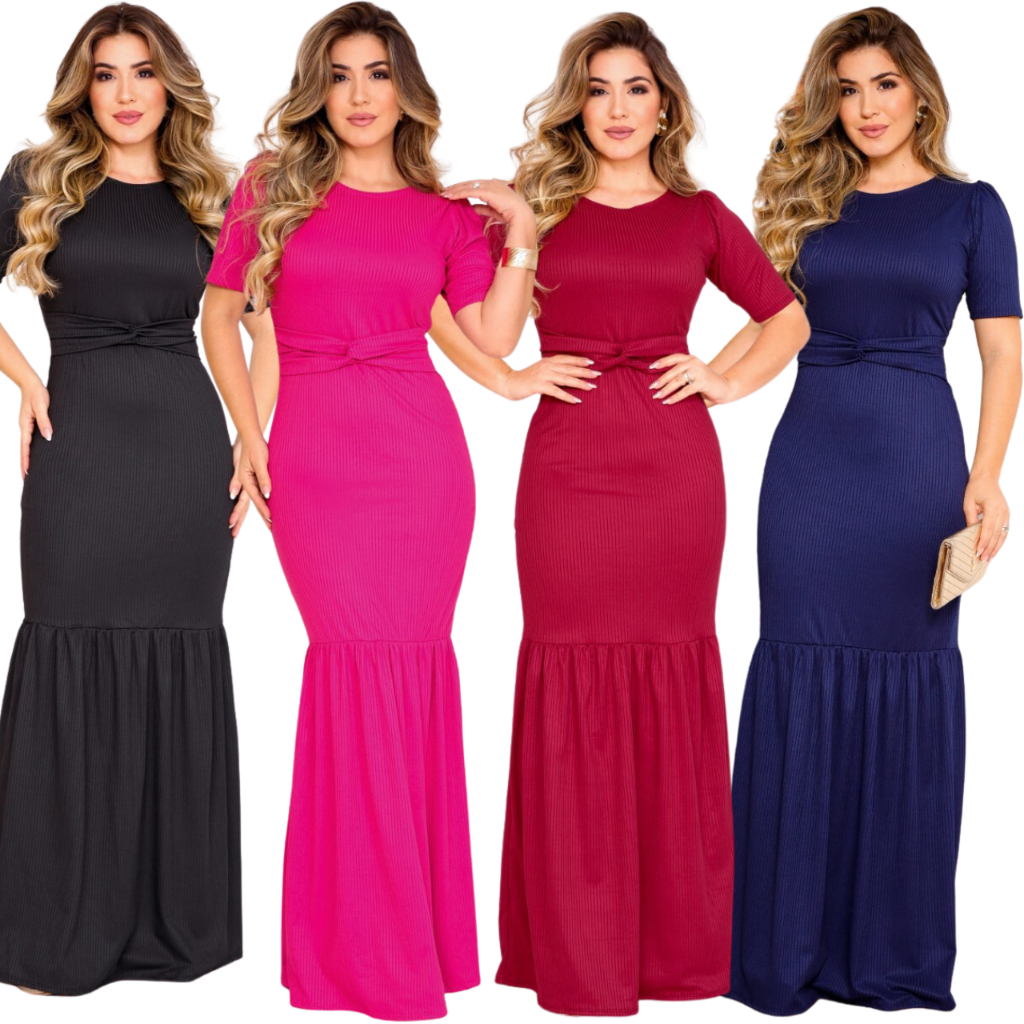 Vestido Feminino de Canelado Longo Cintura Marcada Com Detalhe Saia Maria