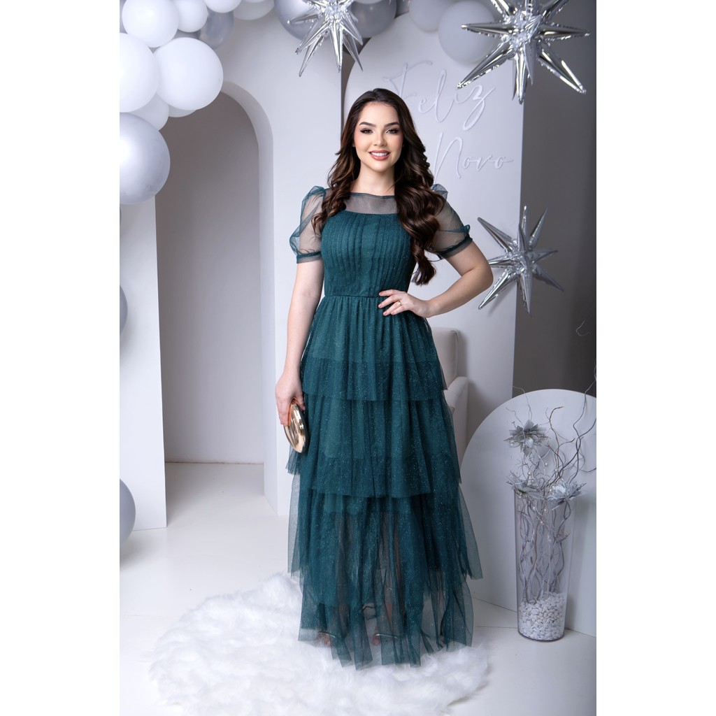 Vestido Longo De Tule Com Brilho Feminino Manga Curta Elegante Para Festa