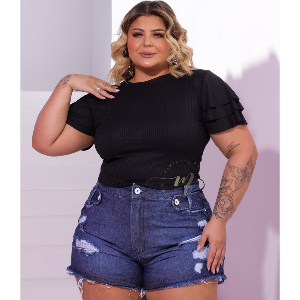 Blusa Feminina Plus Size Canelada Com Manga 3 Babados Detalhe Tendencia Moda