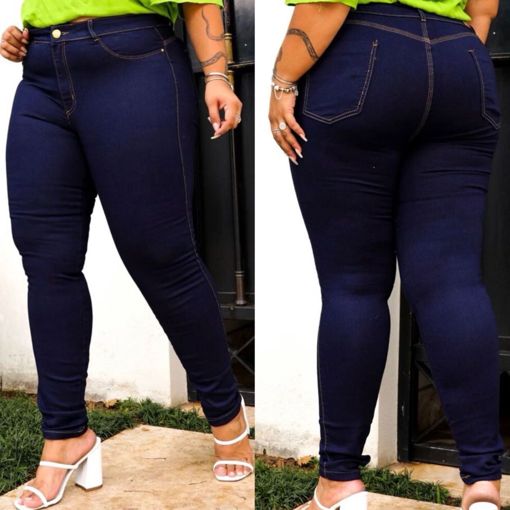 calca azul escura feminina jeans plus size cintura alta com elastano skinny