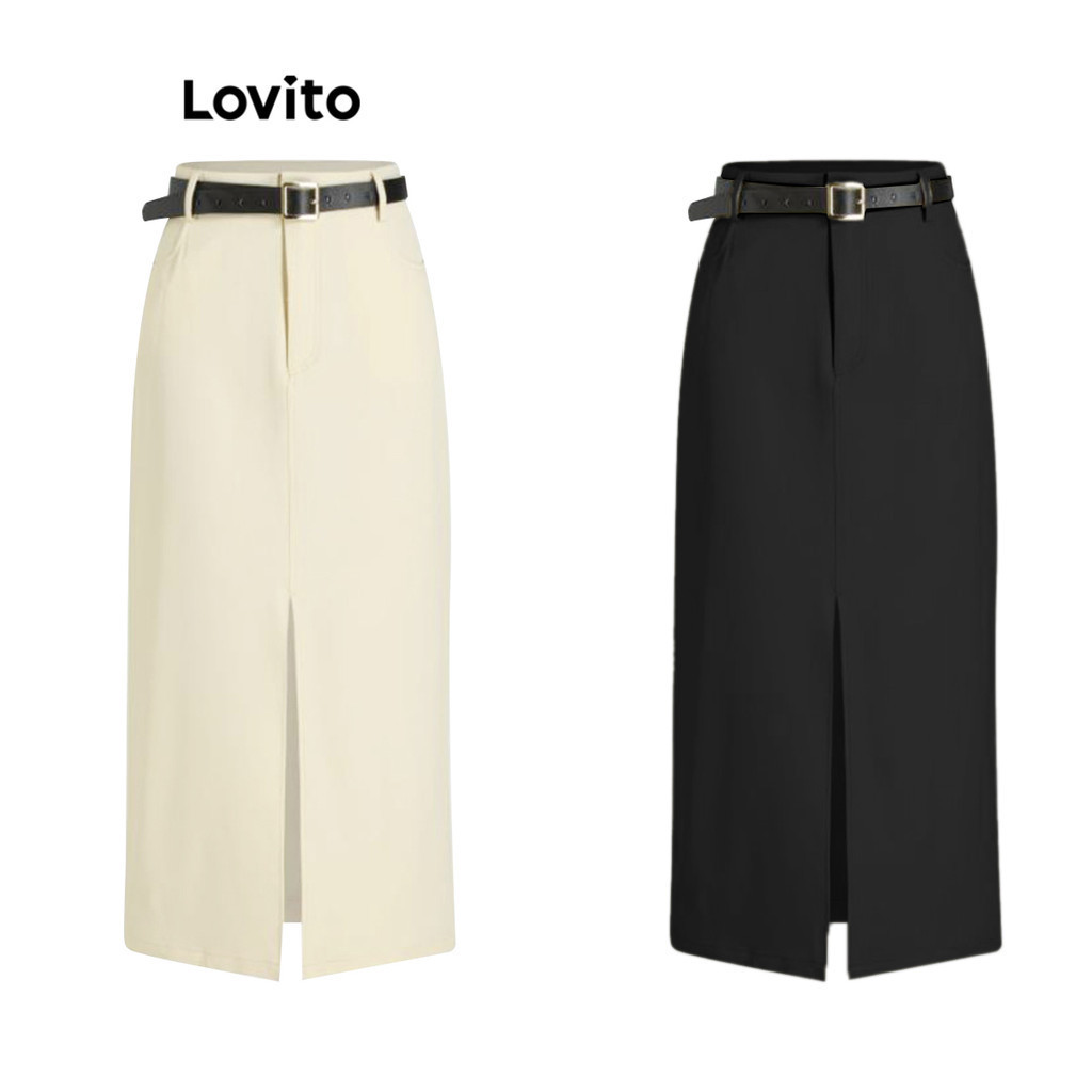 Lovito Casual Saia Feminina Lisa com Fenda Traseira e Bolso L70AD066 (Cinza)