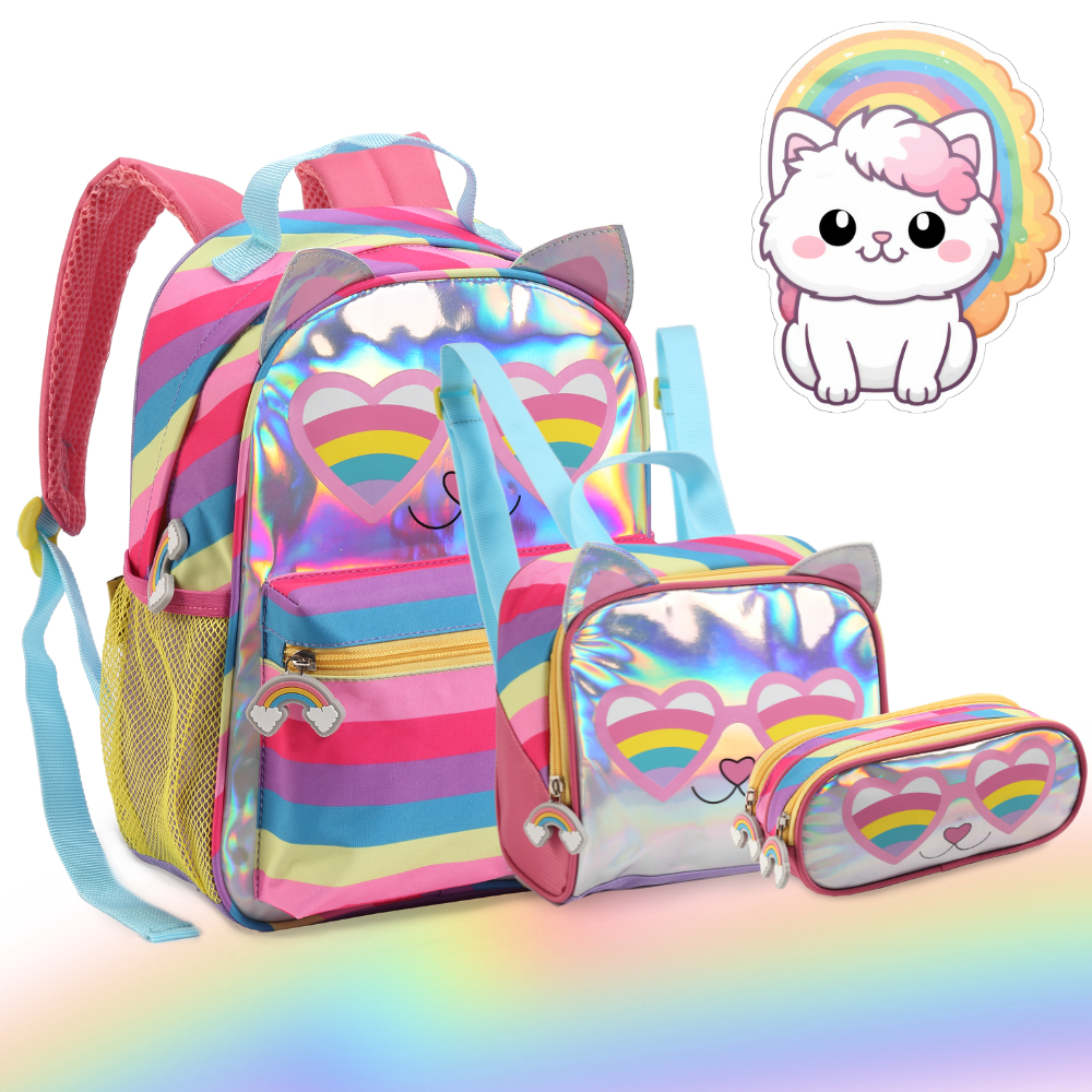 Kit Mochila Escolar GATINHA HOLOGRÁFICA ARCO ÍRIS COM RODINHA modelo 2024 / KIT MOCHILA ESCOLAR INFANTIL MENINA FOFA / KIT MOCHILA DE CARRINHO PARA MENINA