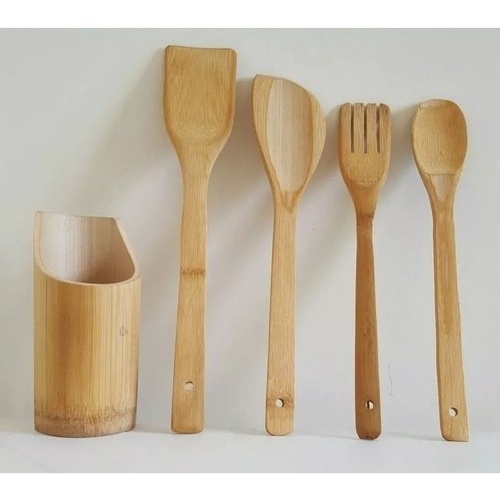 1 Kit Colher De Pau Utensílios Em Bambu 5 (4 talheres + suporte) Peças