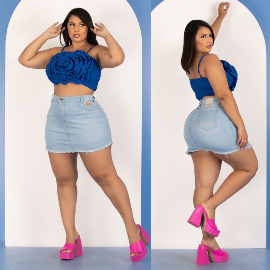saia jeans feminina Curta plus size c/ Lycra Cintura alta