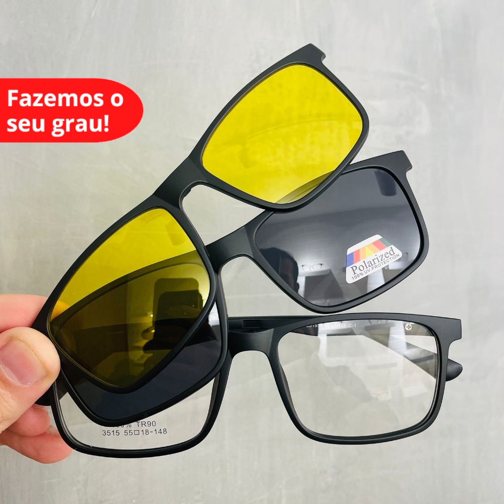 Armação de Oculos Grau e Sol Preto Polarizado Clip On 3 em 1 Masculino Troca Lente Amarelo Dirigir a Noite Mod 2249