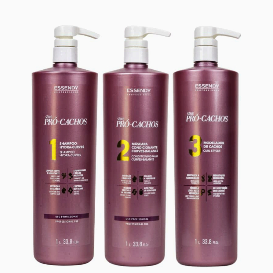 Kit Essendy Pro Cachos De 1L - Shampoo, Máscara e Modelador - 3 Produtos Para Cabelos Crespos Cacheados e Ondulados - Cachos Definidos Ativador de Cachos - Completo Profissional - Linha de Salão