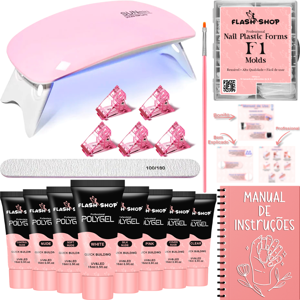 Kit Polygel Molde F1 Mini Cabine Unha Poligel Pincel Presilhas Lixa Alongamento de Unhas