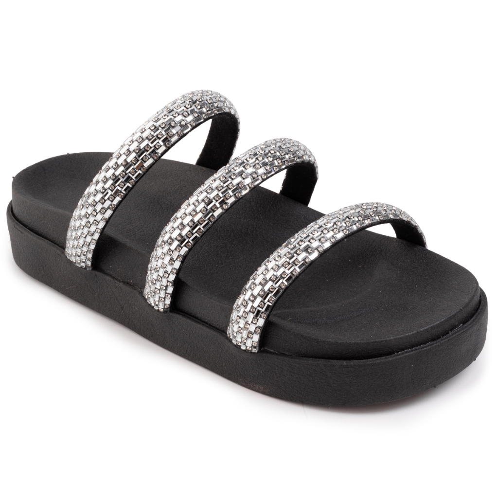 Sandalia Papete Feminina Birken Flat De Brilho Tiras Strass Sola Alta